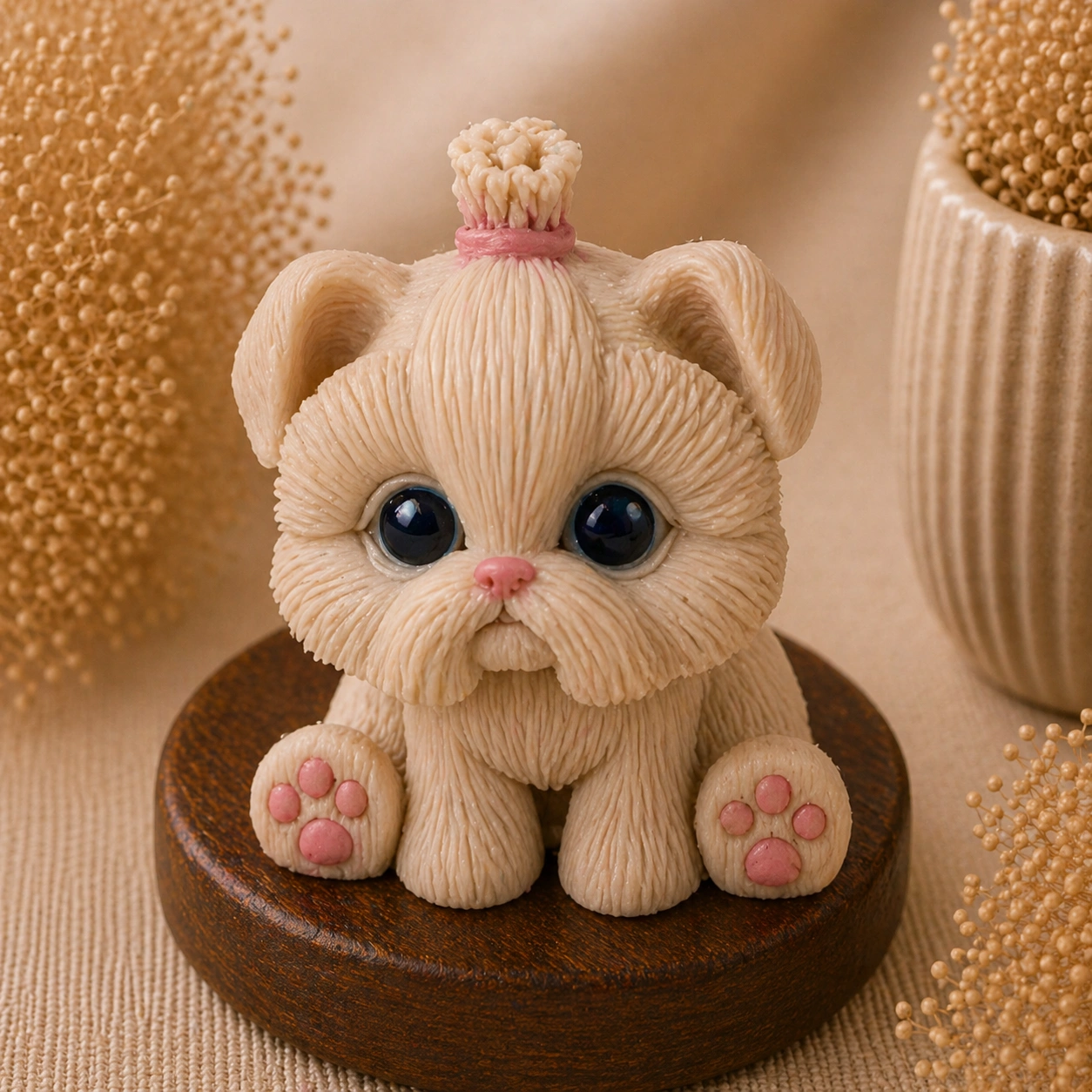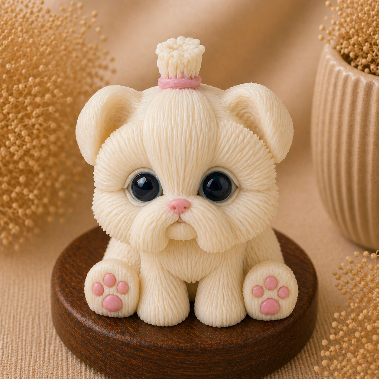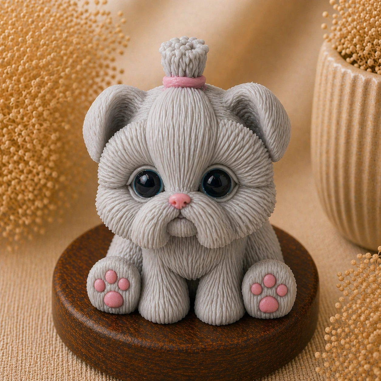 Детали — текстура «пушистой» шерсти, глазки, носик и подушечки лап — делают изделие максимально реалистичным и вызывают эмоциональный отклик.