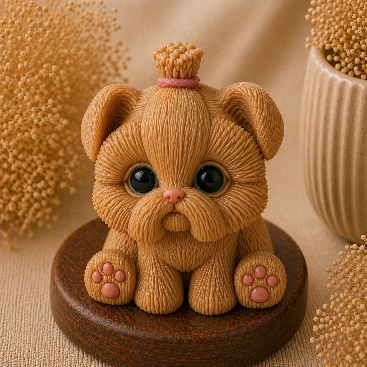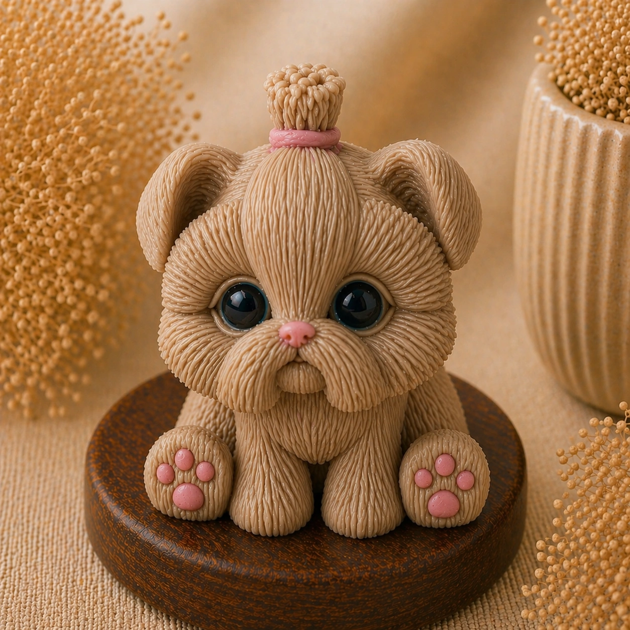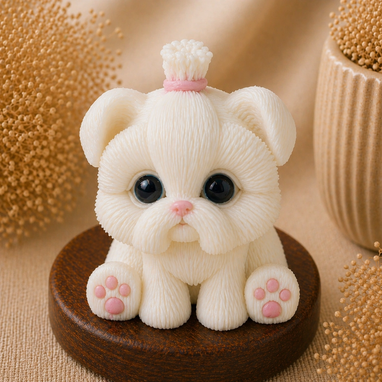 Детали — текстура «пушистой» шерсти, глазки, носик и подушечки лап — делают изделие максимально реалистичным и вызывают эмоциональный отклик.